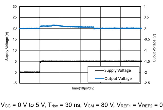The TPA132Q features a unique circuit design that effectively rejects the input common-mode transitions caused by PWM signals. This ensures high current sensing precision and stability in high-frequency noise environments such as motor drives and solenoid valve controls. The figure below shows that the common-mode output voltage remains stable when the common-mode input voltage jumps from 0 V to 80 V. In addition, the TPA132Q current-sense amplifier provides a DC common-mode rejection ratio (CMRR) of up to 150 dB.